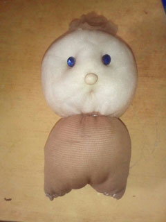 Придаем пупсу форму, там где резинка посередине – в шов втыкаем иголку и вытягиваем ее в месте разделения головы и туловища,затем обратно возвращаем иголку в шов.