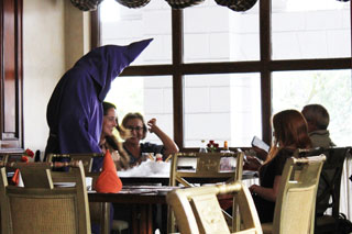 Когда видишь это зрелище первый раз, то становится по-настоящему жутковато. Затихает приятная фоновая музыка, слышится тревожный и пугающий звон колокола, как в фильмах про средневековье и Святую инквизицию, и в зале появляется человек, с ног до головы задрапированный в фиолетовую одежду, с конусом на голове с прорезями для глаз и рта. Он несет поднос с десертом, с которого стекают клубы пара жидкого азота. Кукуручос, как оказалось на самом деле, совсем не злые, и, являясь частью Пасхальных торжеств в Кито, они олицетворяют собой смирение, знаком которого является конус, и покаяние, за которое отвечает фиолетовый цвет. В остальное время их можно встретить только в Café Plaza Grande.