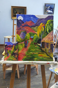 На занятиях мы первым делом учимся перерисовывать картины известных художников. Считается, что таким образом можно очень быстро изучить азы живописи. Вот, например, моя вольная копия с картины Гогена "Дорога на Таити". Ее фотография слева от холста.