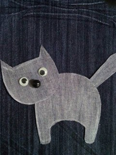 Для котика я вырезала детали из того же денима и просто их перевернула на другую сторону. Пришиваем зигзагом сначала хвостик, потом туловище и уже в последнюю очередь голову котёнка. Полоски из желтой тесьмы я пришила перед этим. Дальше я вышила цветной ниткой усы, пришила носик-пуговку, приклеила глазки. Глазки можно сделать из флиса, фетра, пуговиц. Да и саму аппликацию сделать любую, на что вам хватает фантазии