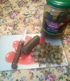 И выкладываем горячие грибы на мясо, чтобы дать ему пропитаться. Пока это происходит, режем кубиками маринованные огурчики. Обязательно маринованные кисло-сладкие, солёные не пойдут, вкус будет у салата не тот, но если под рукой нет таких, то просто добавьте кисло-сладкое яблочко, очищенное и нарезанное кубиками.