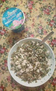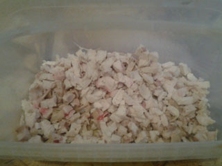 Для начала разбираем мясо отваренной курочки на мелкие кусочки.