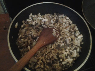 Затем обжариваем лук и соломкой нарезанные шампиньоны, подсолим их немного. По объёму готовых шампиньонов должно быть не меньше, чем мяса. Тогда салат будет сочным.