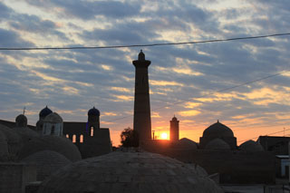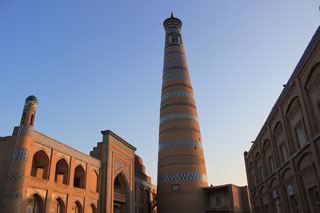 Мое путешествие по узбекской части Великого шелкового пути, который связывал в древности и в Средние века Восточную Азию и страны Средиземноморья, началось в Хиве, в городе-музее под открытым небом. Окруженный мощными крепостными стенами исторический средневековый центр Хивы Ичан-Кала в 1990 году совсем неслучайно стал первым памятником Всемирного наследия ЮНЕСКО в Средней Азии. Великолепно сохранившиеся многовековые городские декорации создают ощущение, что время здесь остановилось. О том, что на дворе ХХI век, не считая организованных групп туристов, напоминают, пожалуй, только пункты обмена валют, вывески туристических агентств, предлагающие экскурсии по городу и вечернее электрическое освещение и подсветка главных достопримечательностей.