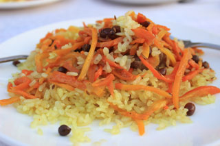 В этой аутентичной и романтичной атмосфере сказок 1001 ночи состоялось мое первое свидание с ним.., с многоликим королем узбекской национальной кухни, пловом. Это блюдо действительно крайне многостороннее. Существует несчетное количество его разновидностей и совершенно невозможно написать рецепт «настоящего» узбекского плова. Его, так сказать, «базовый» состав включат в себя рис (обычно сорта девзира), морковь, чеснок, зиру и баранье курдючное сало. Все остальные ингредиенты, начиная от мяса (это может быть баранина, говядина, мясо птицы, дичь и даже рыба), овощей, сухофруктов и специй, заканчивая даже крупами (вместо риса иногда используют пшеницу, кукурузу, маш, горох или джугару) зависят от местности, в которой готовят плов и от вкуса и настроения готовящего.