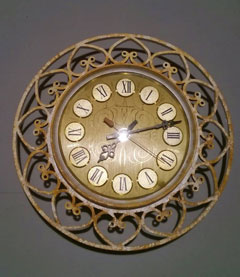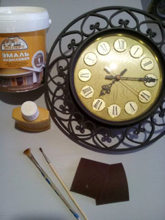 Старые, но работающие часы, краска, кисточка, кусочек наждачной бумаги, колер любого цвета и кусочек губки.