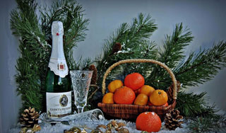 * выкладывает пакет с мандаринами и ставит бутылку шампанского*