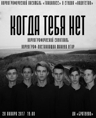 Недавно довелось мне побывать на очень интересной хореографической постановке, называющейся "Когда тебя нет". Это был настоящий хореографический спектакль – яркий, эмоциональный, очень сильный и по музыкальному сопровождению, и по пластике.