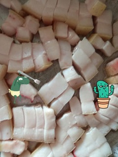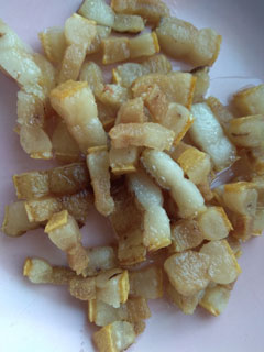 Берём кусочек сала. Нарезаем крупными кусочками и жарим.