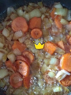 Морковь и лук нарезаем тоже крупными кубиками и готовим в жиру после печени.