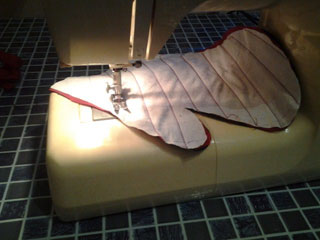 На верхнюю сторону рукавички пришиваю готовую аппликацию. Стачиваем, то есть сшиваем обе части рукавичек – верхнюю и нижнюю. Важно! Аппликацию пришивать до стачивания деталей.