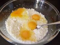 Затем добавляем другие ингредиенты: яйца, сахар, манку (или муку). Перемешиваем