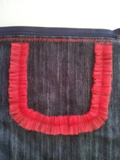 Сначала нужно пришить одну сторону молнии, можно сделать декоративную отстрочку. Затем я нарезала полоски фатина шириной 3 см и, делая складочки, пристрочила по контуру кармана. Чтобы спрятать края фатина, настрочила тесьму. Для удобства сразу пришила пуговицы и бусины.