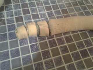 Скатываем пласт в рулетик и нарезаем на кусочки. Толщину варьируйте сами